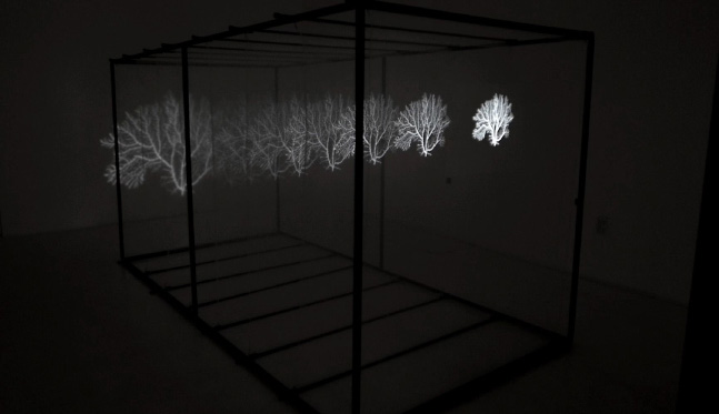 Multidimensional installation consisting of a projection device of animated visual sequences that reiterate the illusory decomposition of planes, taking it to a new visual-spatial territory.
